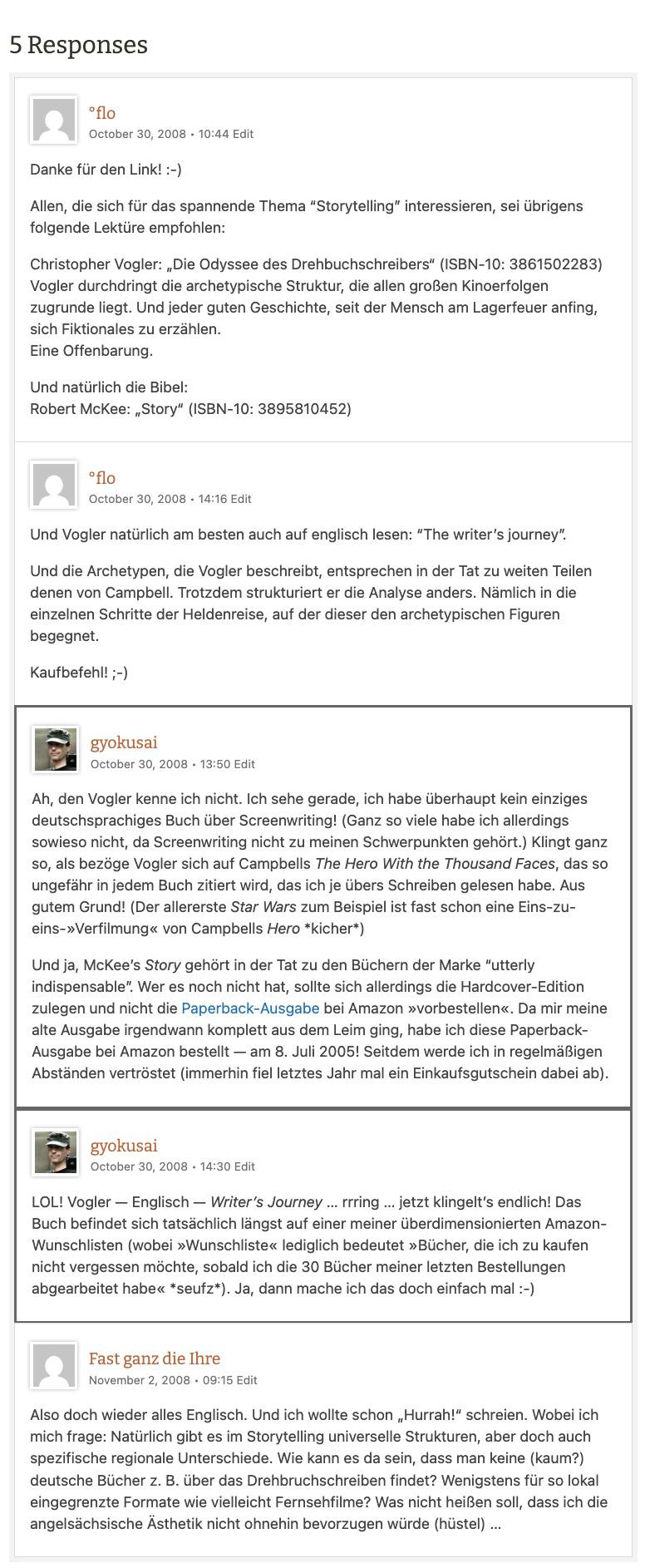 Also doch wieder alles Englisch. Und ich wollte schon „Hurrah!“ schreien. Wobei ich mich frage: Natürlich gibt es im Storytelling universelle Strukturen, aber doch auch spezifische regionale Unterschiede. Wie kann es da sein, dass man keine (kaum?) deutsche Bücher z. B. über das Drehbruchschreiben findet? Wenigstens für so lokal eingegrenzte Formate wie vielleicht Fernsehfilme? Was nicht heißen soll, dass ich die angelsächsische Ästhetik nicht ohnehin bevorzugen würde (hüstel) …](https://betweendrafts.com/wp-content/uploads/2008/10/comments-2008-30-10b.jpg)