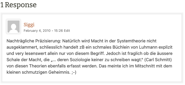 Nachträgliche Präzisierung: Natürlich wird Macht in der Systemtheorie nicht ausgeklammert, schliesslich handelt zB ein schmales Büchlein von Luhmann explizit und very lesenswert allein nur von diesem Begriff. Jedoch ist fraglich ob die äussere Schale der Macht, die „… deren Soziologie keiner zu schreiben wagt.“ (Carl Schmitt) von diesen Theorien ebenfalls erfasst werden. Das meinte ich im Mitschnitt mit dem kleinen schmutzigen Geheimnis. ;-)](https://betweendrafts.com/wp-content/uploads/2010/02/comments-2010-02-04.png)