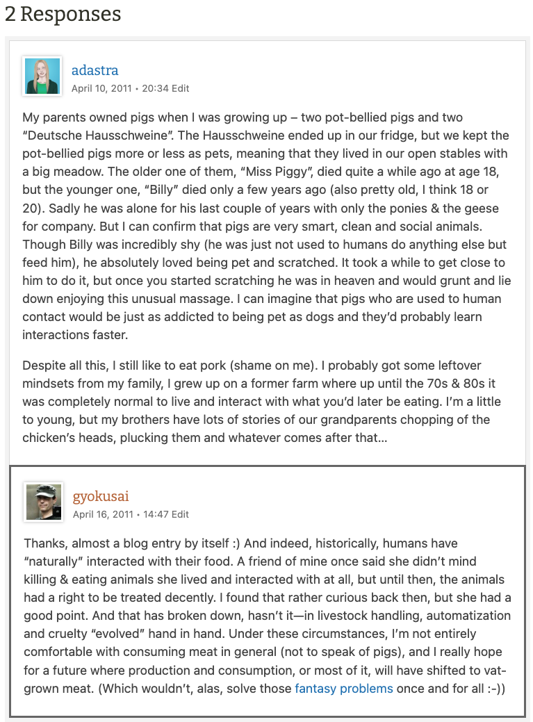 Thanks, almost a blog entry by itself :) And indeed, historically, humans have “naturally” interacted with their food. A friend of mine once said she didn’t mind killing & eating animals she lived and interacted with at all, but until then, the animals had a right to be treated decently. I found that rather curious back then, but she had a good point. And that has broken down, hasn’t it—in livestock handling, automatization and cruelty “evolved” hand in hand. Under these circumstances, I’m not entirely comfortable with consuming meat in general (not to speak of pigs), and I really hope for a future where production and consumption, or most of it, will have shifted to vat-grown meat. (Which wouldn’t, alas, solve those fantasy problems [ https://gizmodo.com/is-vat-grown-meat-kosher-we-asked-a-rabbi-5458425 ] once and for all :-))](https://betweendrafts.com/wp-content/uploads/2010/02/comments-2011-04-10.png)
