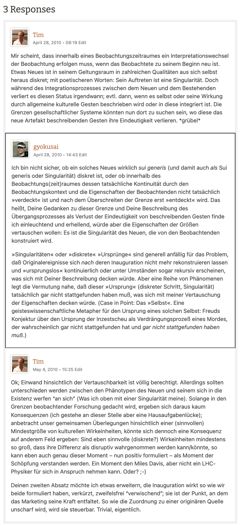 Deinen zweiten Absatz möchte ich etwas erweitern, die Inauguration wirkt so wie wir beide formuliert haben, verkürzt, zweifelsfrei “verwischend”; sie ist der Punkt, an dem das Marketing seine Kraft entfaltet. So wie die Zuordnung zu einer originären Quelle unscharf wird, wird sie steuerbar. Trivial, eigentlich.](https://betweendrafts.com/wp-content/uploads/2010/04/comments-2010-04-28.jpg)