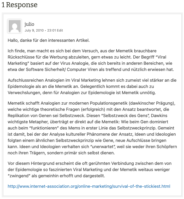 Ich finde, man macht es sich bei dem Versuch, aus der Memetik brauchbare Rückschlüsse für die Werbung abzuleiten, gern etwas zu leicht. Der Begriff “Viral Marketing” basiert auf der Virus Analogie, die sich bereits in anderen Bereichen, wie etwa der Software Sicherheit/ Computer Viren als treffend und nützlich erwiesen hat.