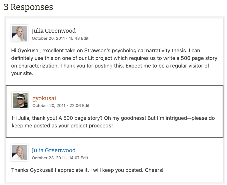 Hi Gyokusai, excellent take on Strawson’s psychological narrativity thesis. I can definitely use this on one of our Lit project which requires us to write a 500 page story on characterization. Thank you for posting this. Expect me to be a regular visitor of your site.