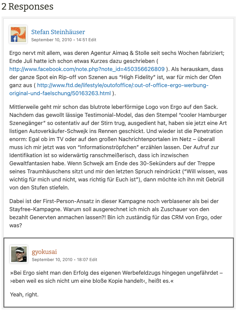 Woran Werber zu allen Zeiten und mit wachsender Begeisterung ihr intellektuelles Mütchen kühlen, ist die Werbung anderer: ein Unterfangen, für das ich — milde gesagt — Vorbehalte hege. Denn weder kenne ich die Werbeabsicht, noch die Zielgruppe, noch den Erfolg, die diese Werbung hat. (Und mit »Erfolg«, das dürfte klar sein, sind nicht Kreativpreise gemeint.) Aber es gibt eine Reihe von offensichtlichem Blödsinn, der aus Faulheit entsteht: Der Faulheit, etwas gründlich zu recherchieren und der Faulheit, ein Anliegen präzise auszudrücken. Dies sind die Dinge, die hier in Killed by Copy von Zeit zu Zeit aufs Korn genommen werden.