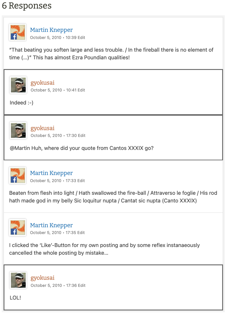 “That beating you soften large and less trouble. / In the fireball there is no element of time (…)” This has almost Ezra Poundian qualities!