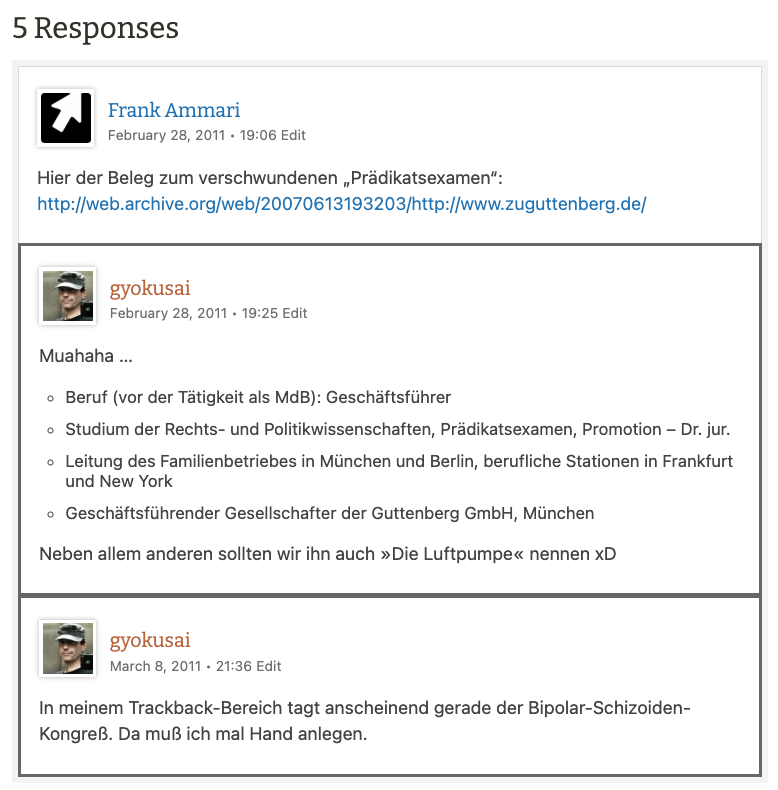 Und so ganz nebenbei ist nun auch das Wort »Prädikatsexamen« von zu Guttenbergs Website wie von Zauberhand entführt verschwunden. Ein »Prädikatsexamen« beginnt im länderübergreifenden Gebrauch unter Juristen erst mit der Note »voll befriedigend«, auch wenn dies in dem einen oder anderen Bundesland noch als Prädikat bzw. »kleines Prädikat« durchgeht. Also keine große Lüge, sondern nur ein kleines Lügchen — genau wie seine Erfahrung in der Wirtschaft als »Geschäftsführer eines mittelständischen Unternehmens«.