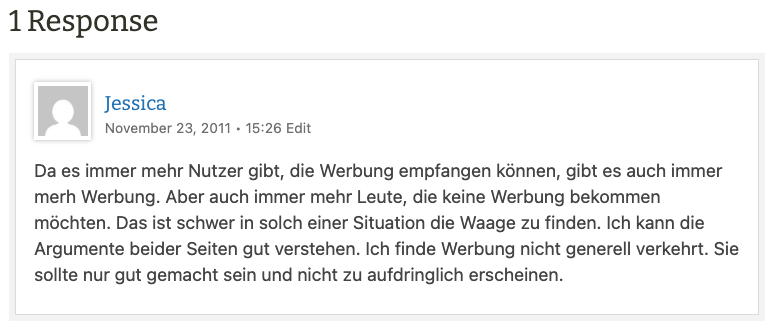 Da es immer mehr Nutzer gibt, die Werbung empfangen können, gibt es auch immer merh Werbung. Aber auch immer mehr Leute, die keine Werbung bekommen möchten. Das ist schwer in solch einer Situation die Waage zu finden. Ich kann die Argumente beider Seiten gut verstehen. Ich finde Werbung nicht generell verkehrt. Sie sollte nur gut gemacht sein und nicht zu aufdringlich erscheinen.](https://betweendrafts.com/wp-content/uploads/2011/10/comments-2011-11-23.png)