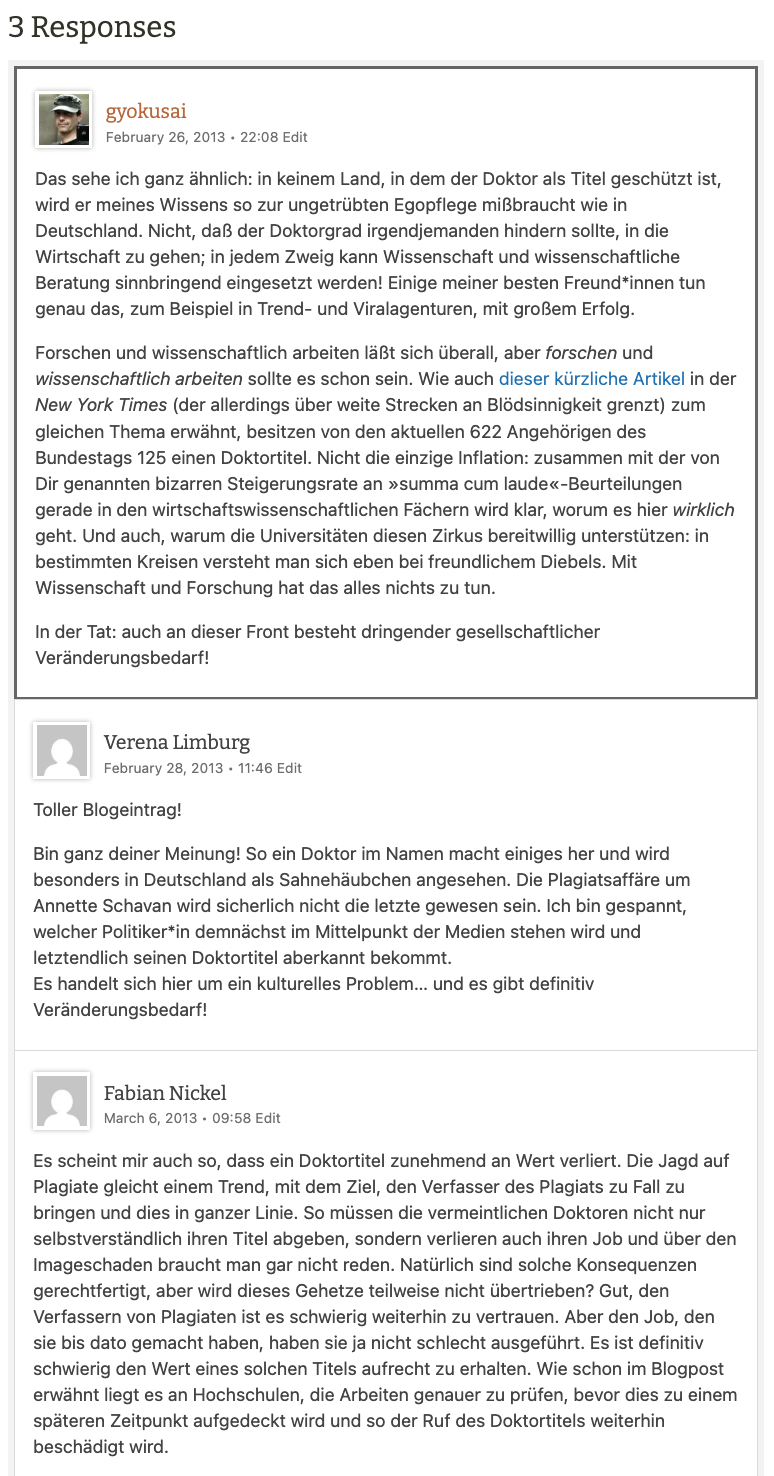 Das sehe ich ganz ähnlich: in keinem Land, in dem der Doktor als Titel geschützt ist, wird er meines Wissens so zur ungetrübten Egopflege mißbraucht wie in Deutschland. Nicht, daß der Doktorgrad irgendjemanden hindern sollte, in die Wirtschaft zu gehen; in jedem Zweig kann Wissenschaft und wissenschaftliche Beratung sinnbringend eingesetzt werden! Einige meiner besten Freund*innen tun genau das, zum Beispiel in Trend- und Viralagenturen, mit großem Erfolg.