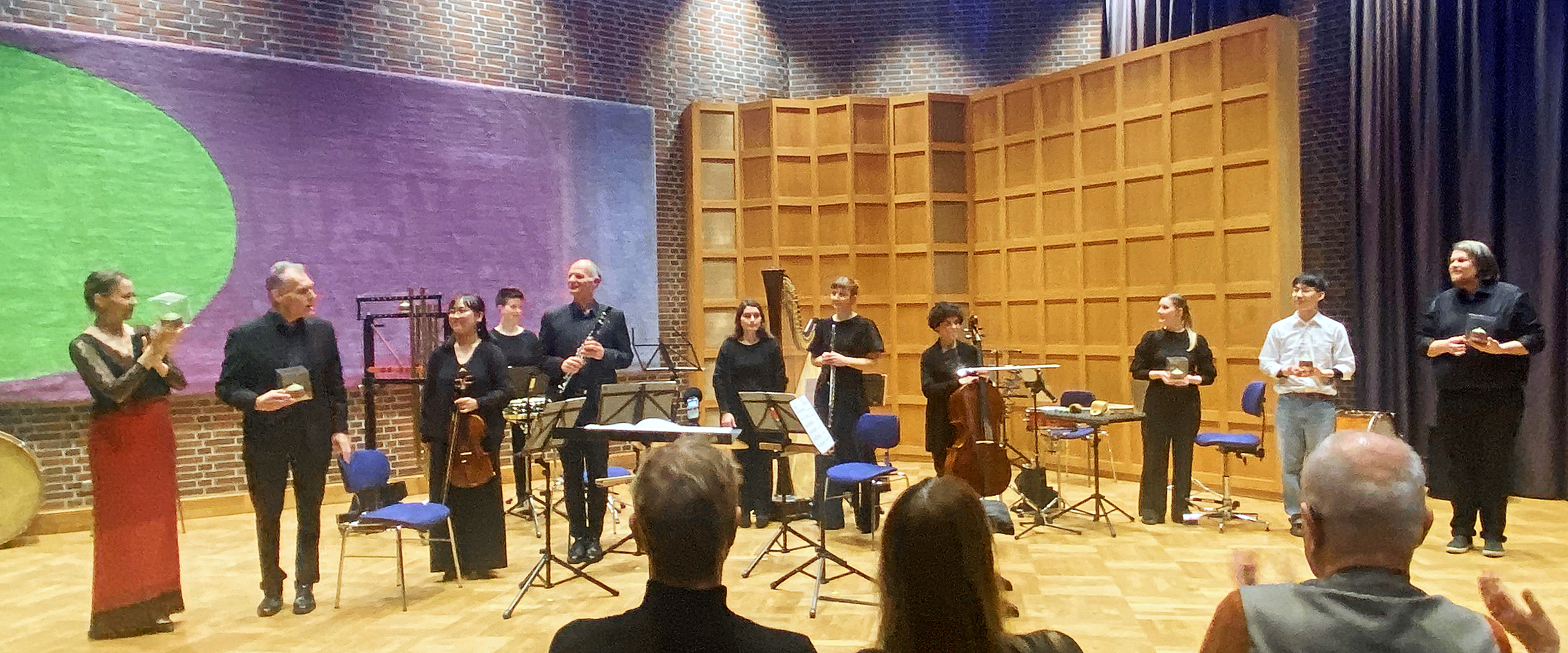 Great stuff: two more “Sequenza” pieces by Luciano Berio, one for akkordeon and on for harp; Casey Cangelosi’s whimsical, choreographied “Plato’s Cave” for percussion duo; Elena Mendoza’s «Se hace saber» for French horn and percussion; and »Schmelzofen« for nine instruments by Yamaguchi Yasuko (in attendance). I’m always in awe about this ensemble’s quality, and all the pieces were fabulous. On the photograph (click to embiggen), sadly, Roman Yusipey (accordeon), Bert Bürgers (French horn), Fujieda Yukiko (piano), Xenia Narati (harp), and both the terrific percussionists Vera Seedorf and Salome Amend are missing.